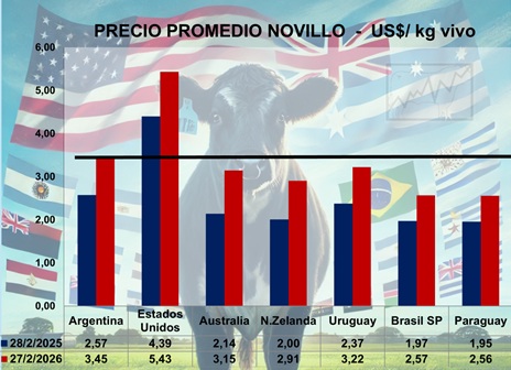 Precios promedio de novillos, vacas en US$ Argentina, Brasil, Uruguay, Paraguay, EE.UU. , Australia y Nueva Zelanda
