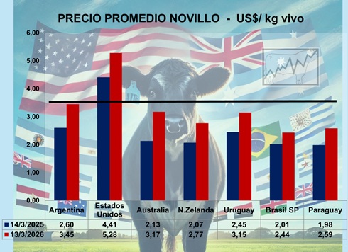 Precios promedio de novillos, vacas en US$ Argentina, Brasil, Uruguay, Paraguay, EE.UU. , Australia y Nueva Zelanda.