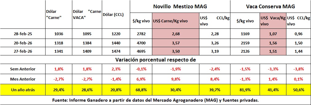Después de semanas con bajas consecutivas, se observó una recuperación en la cotización del dólar; pese a ello, en relación al cierre de enero, hubo una apreciación de nuestra moneda del 2.7 por ciento. La evolución del dólar se conjugó con una disminución del precio del novillo, que había llegado siete días atrás al equivalente de 3.60 US$/kg vivo, un récord "histórico".