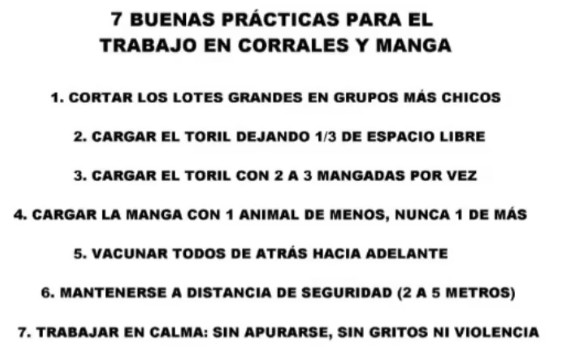 Resumo mi aporte en estas 7 prácticas muy simples para trabajar mejor en corrales y mangas. No dependen de que nadie cambie su forma de pensar sobre el ganado, ni tampoco exigen ninguna cosa que atente contra la cultura del trabajo contra el ganado. Sólo se necesita cumplir con unas pocas reglas fáciles de entender, de aplicar y de monitorear. Nadie se puede sentir afectado en sus derechos por cargar menos el toril o la manga, por manejar la hacienda en cortes, por cargar 3 mangadas en vez de 5 o 7, etc. Habrá quienes echen de menos el manoseo, los golpes y el griterío, pero el día que trabajen en silencio y sin apuro quizás cambien de idea.