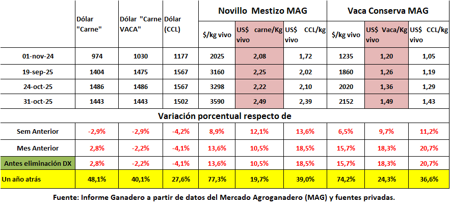 En el MAG, hubo un aumento significativo en el valor del Novillo Mestizo, que llegó a 2.50 US$/kg vivo. La Vaca batió un nuevo récord con 2152 $/kg vivo (1.49 US$/kg vivo).
