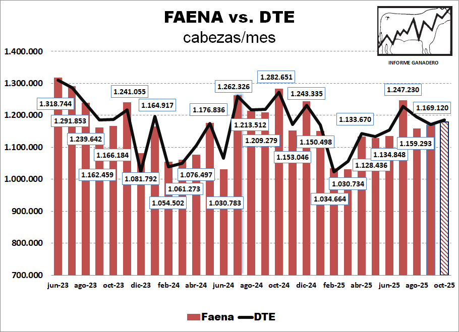 En los primeros diez meses de este año, el total de DTE fue ligeramente inferior al verificado en igual lapso de 2024: 11.5 millones de cabezas.