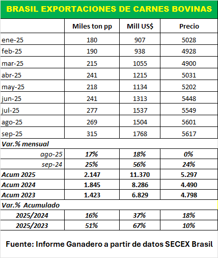 En el mes de setiembre de 2025, las exportaciones de carnes bovinas enfriadas y congeladas del Brasil sumaron 315 mil toneladas peso producto, la cifra más elevada de su historia y un 14 por ciento mayor al máximo anterior que, con 277 mil toneladas, se verifico en julio de este año.