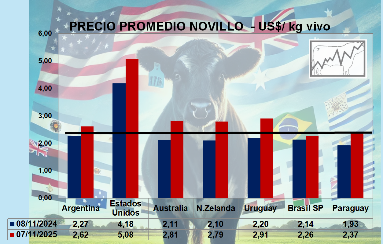 Precios Comparativos en US$ Novillos - Vacas en Argentina, Brasil, Uruguay, Paraguay, Australia, Nueva Zelanda y Estados Unidos