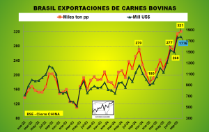 Evolución mensual y acumulada de las exportaciones de carnes bovinas enfriadas y congeladas. Datos SECEX Brasil