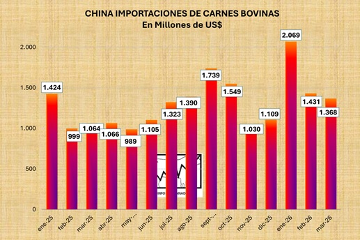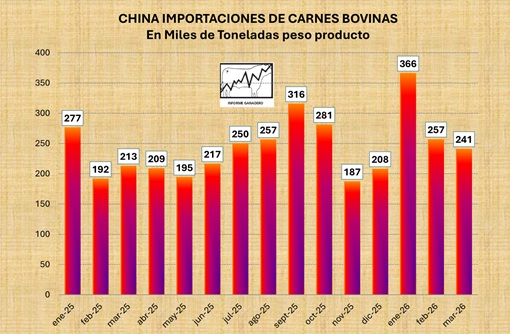 En el mes de marzo de 2026, las importaciones chinas de carnes bovinas enfriadas y congeladas sumaron 241 mil toneladas, por debajo de febrero, aunque 13 por ciento por encima a doce meses atrás. El valor de las importaciones fue de 1368 millones de dólares, con un precio medio de 5984 US$/tonelada.