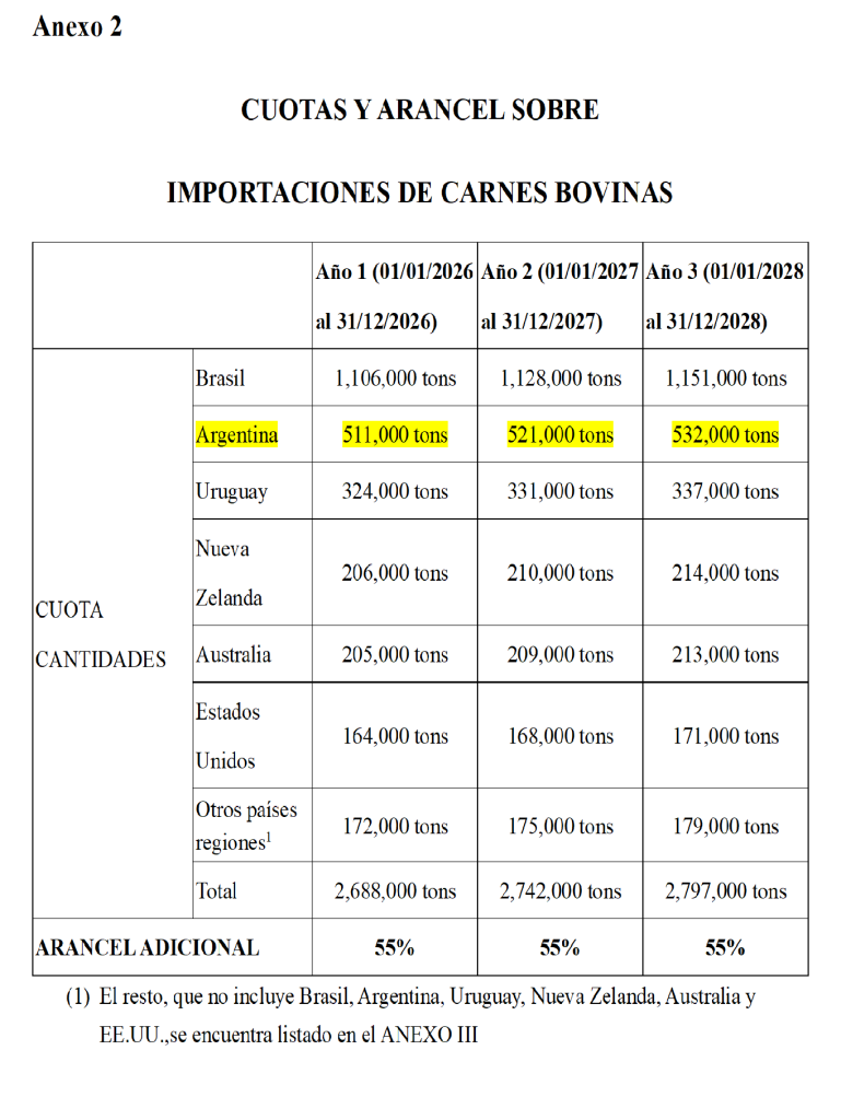 A partir del 1 de enero de 2026, si la cantidad de carne de vacuno importada no excede la cantidad especificada (véase el anexo 2), el importador pagará derechos de aduana de acuerdo con el tarancelario vigente aplicable al importar carne de vacuno, y la cuota no utilizada en el año anterior no se trasladará al año siguiente.