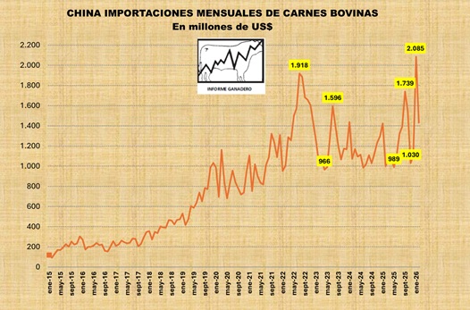 Las estadísticas de importaciones de carnes rojas, aves y menudencias del primer bimestre de 2026 anticipaban un volumen récord que se ha confirmado con los datos preliminares de las importaciones de carnes bovinas dados a conocer por la Aduana China (GACC por sus siglas en inglés).
