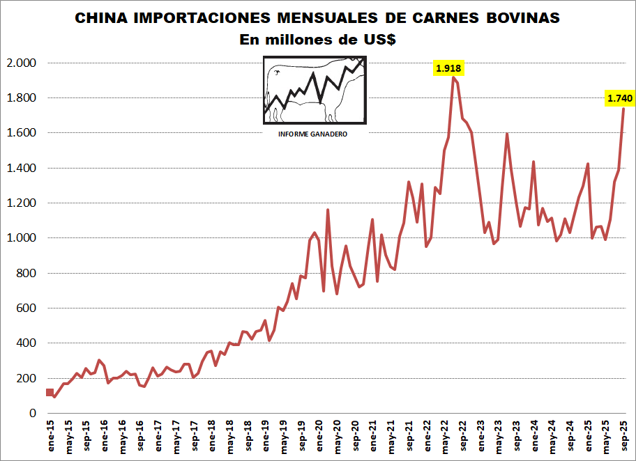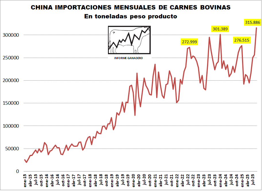 En setiembre de 2025, las importaciones chinas de carnes bovinas enfriadas y congeladas alcanzaron un máximo histórico en volumen 316 mil toneladas peso producto por valor de 1740 millones de dólares.