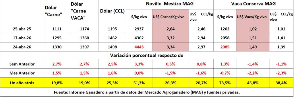 En la semana cerrada el 24 de abril, hubo una suba en el tipo de cambio que se combinó con alzas en el MAG, lo que determinó que el valor del Novillo se mantuviera estable en términos de la divisa estadounidense. En relación a abril del año pasado, se registran incrementos del 26 por ciento y 46 por ciento, para el Novillo Mestizo y la Vaca Conserva, respectivamente