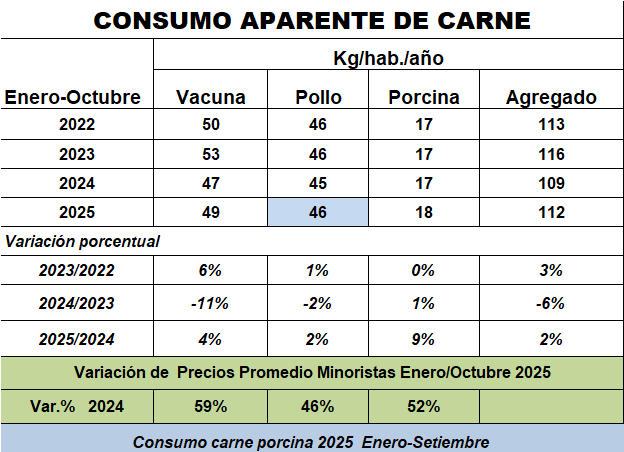 En los primeros diez meses de 2025, el promedio del consumo agregado se elevó a 112 kg/habitante/año. Todas las carnes experimentaron una suba respecto del año precedente, si bien el cerdo tuvo el incremento más sostenido y de mayor magnitud.