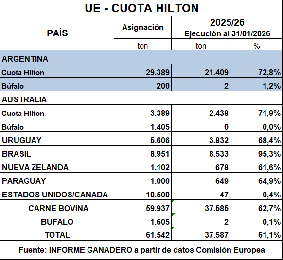 La Comisión Europea informó la adjudicación de los contingentes disponibles para importar carnes bovinas de alta calidad (cuota Hilton) actualizados al 31 de enero pasado. El nivel de ejecución de los países beneficiarios continuó denotado una demanda interesada en el mercado europeo.