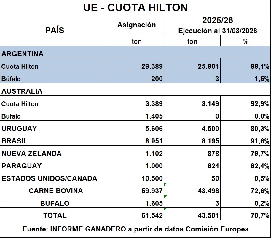 Los datos para Argentina son los mismos que los reportados por nuestras autoridades, confirmando un remanente de 3488 toneladas para ejecutar la totalidad del contingente 2025/2026, que desde mayo tendrá el aliciente adicional de operarse con un arancel del 0 por ciento, una ventaja que ha elevado los precios de la cuota Hilton a niveles sin precedentes (24 mil dólares la tonelada!).