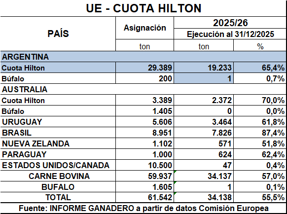 Cuota Hilton: nivel de ejecución al cierre de 2025