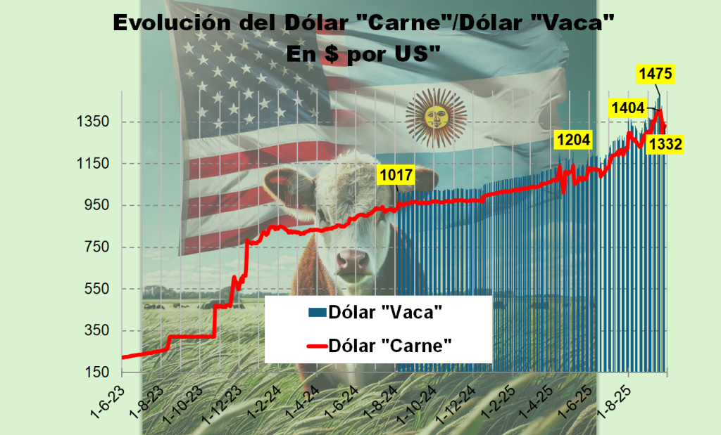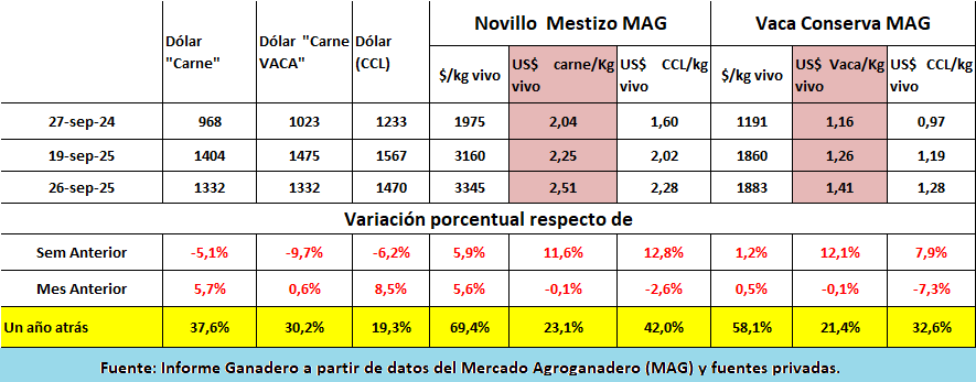 En función de la evolución del mercado cambiario, ello ha implicado una disminución en el tipo de cambio comparando con siete días atrás del 5 y 10 por ciento, respectivamente, en el tipo de cambio del Dólar Carne y del Dólar Vaca.