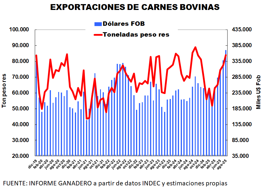 Las exportaciones argentinas de carnes bovinas alcanzaron 84 mil toneladas en equivalente peso res, según estimaciones propias basadas en datos de INDEC. Esto representa un aumento del 8% respecto al mes anterior y una baja del 2% comparado con agosto de 2024. El aumento por tercer mes consecutivo ha determinado que las exportaciones se acerquen al récord verificado en setiembre del año pasado (89 mil toneladas peso res).