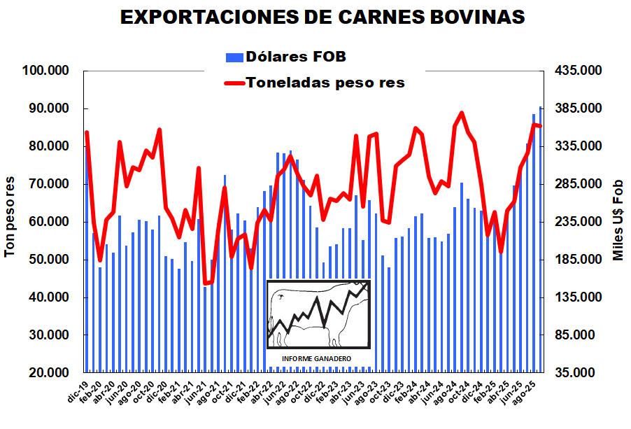 Las exportaciones argentinas de carnes bovinas repitieron la cifra del mes anterior: 85 mil toneladas en equivalente peso res, según estimaciones propias basadas en datos de INDEC. Esto representa una reducción del 3% comparado con setiembre de 2024. La tendencia ascendente que registraron nuestros embarques los ha colocado en un nivel cercano al récord verificado en setiembre del año pasado (89 mil toneladas peso res).