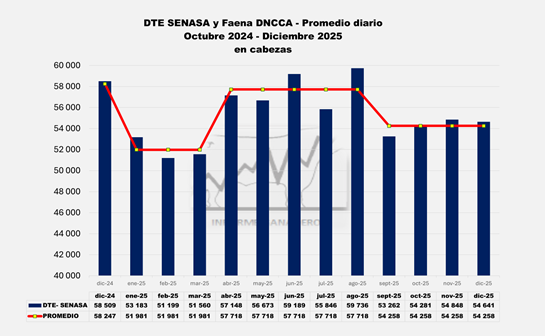 SENASA informó que en el último mes de 2025 se emitieron DTE con destino a faena para 1.092.811 bovinos, 2 por ciento más que en noviembre, pero en términos del promedio diario implicó que se mantuvo estable el número de animales remitidos por tercer mes consecutivo y por debajo de los registros de 2024, en este caso, fue 7 por ciento menor a diciembre del año pasado.