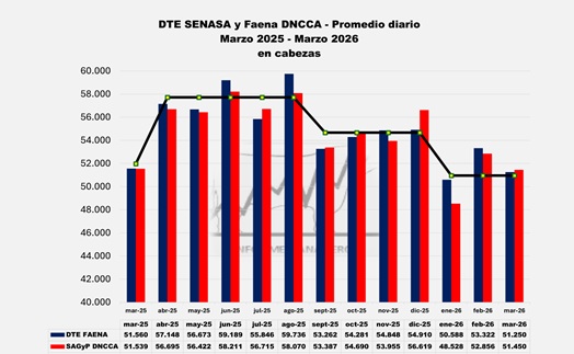 En marzo de 2026, la faena fue de 1.029 miles de bovinos, un 11 por ciento más que el mes precedente. Un aumento atribuible al hecho de que marzo tuvo una mayor cantidad de días hábiles: a un mes “corto” se agregaron los feriados de Carnaval y un paro de actividades, en consecuencia, cuando se compara el promedio diario por día hábil se advierte una caída del 3 por ciento con relación al febrero, mientras que fue ligeramente inferior al registro de marzo de 2025.