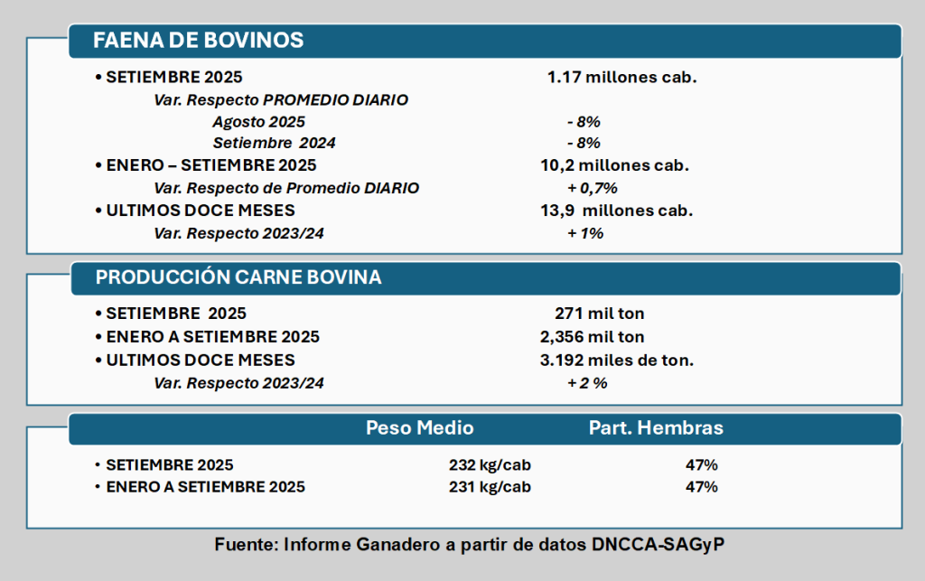 La faena acumulada en los primeros nueve meses de este año sumó 10.188.492 vacunos, 1 por ciento superior al promedio diario de igual lapso de 2024. En términos de producción cárnica, fue de 2356 mil toneladas, ligeramente mayor al acumulado a setiembre del año pasado.