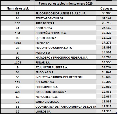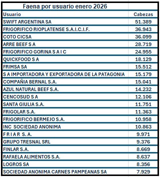 Cabezas faenadas por establecimiento y por usuario en el mes de enero 2026.