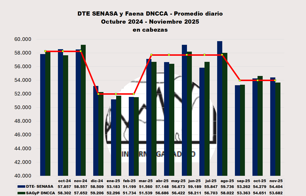 En noviembre de 2025, la faena de bovinos alcanzó 1.046.793 cabezas, una fuerte reducción respecto del mes anterior (-13 por ciento), que se atenúa por tratarse de un período con menor cantidad de días hábiles. Si se considera el promedio diario de faena, la disminución fue del 2 por ciento, aunque trepó al 7 por ciento en comparación a noviembre de 2024, confirmando la caída de la oferta registrada en el último trimestre que se reflejaba en la emisión de DTE.