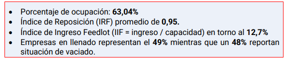 Los asociados a la Cámara Argentina de Feedlot, con una capacidad de encierre de 886.958 cabezas, reportaron un nivel de ocupación ligeramente inferior al mes anterior, pero por encima de doce meses atrás al 1ro. de febrero de 2026. A continuación alguna información adicional: