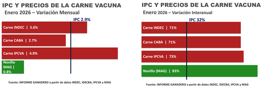 • En enero de 2026 los precios de los cortes bovinos relevados por INDEC para su Indice de Precios al Consumidor (IPC-INDEC) experimentaron un incremento del 3.6 por ciento respecto del mes anterior. Fue superior a la variación del promedio de los cortes bovinos relevados por el IPC-CABA pero estuvo por debajo del Informe del IPCVA que llegó al 5 por ciento.