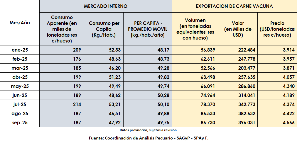 En los primeros nueve meses de este año, el consumo aparente per capita fue equivalente a 50 kg/año y tuvo una recuperación comparando con 2024, en que registró una caída histórica. La reducción de los embarques en los primeros meses de 2025 y el aumento de la faena/producción registrado en los últimos meses ha sustentado esta suba.