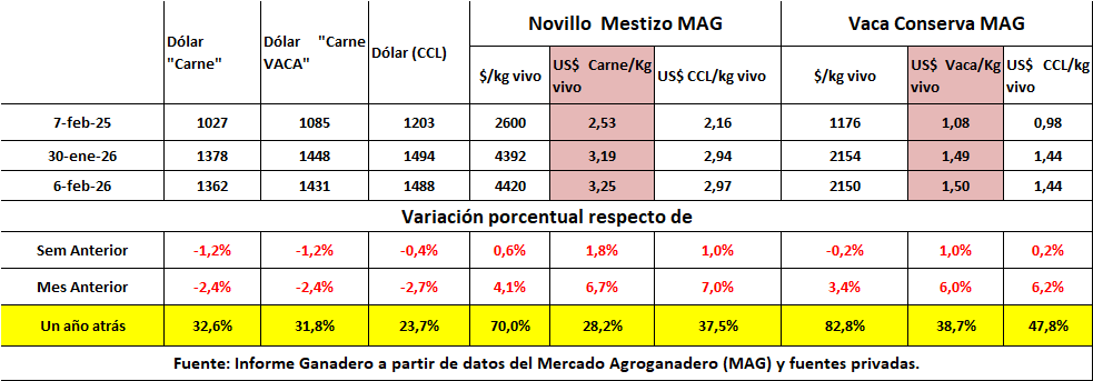 El cierre de una semana con novedades importantes para el sector y una recuperación en el valor de nuestra divisa, ha acentuado el terminos de dólar el incremento en el precio de la hacienda en el MAG, particularmente en el Novillo, que trepó al equivalente de 3.25 US$/kg vivo