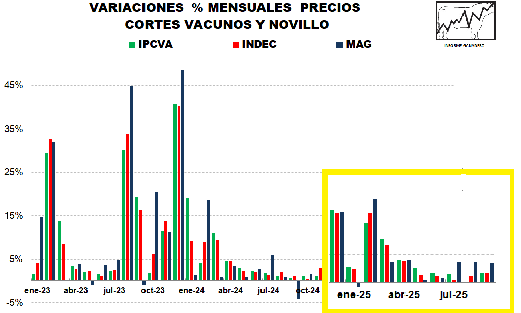 • En SETIEMBRE de 2025, los precios de los cortes bovinos relevados por INDEC para su Indice de Precios al Consumidor (IPC-INDEC) experimentaron un incremento del 1.6 por ciento respecto del mes anterior. Fue mayor a la variación del promedio de los cortes bovinos relevados por el IPC-CBA (1.1%) y similar al Informe del IPCVA.