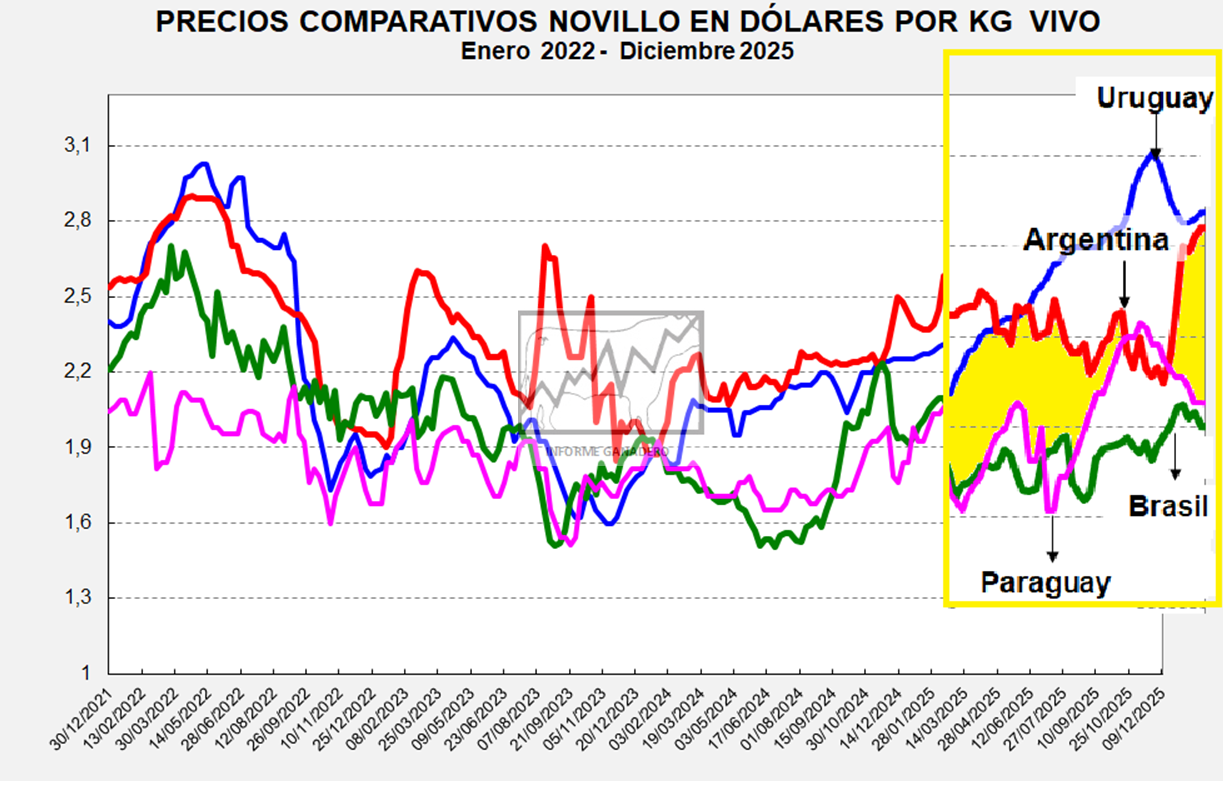 Precios Comparativos en US$ Novillos - Vacas en Argentina, Brasil, Uruguay, Paraguay, Australia, Nueva Zelanda y Estados Unidos