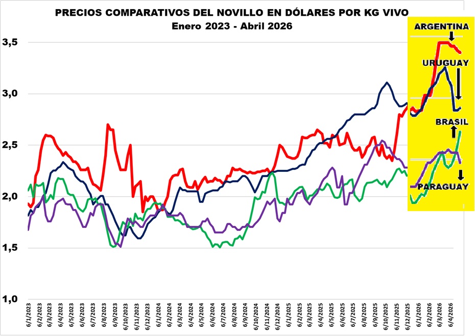 Precios promedio de novillos, vacas en US$ Argentina, Brasil, Uruguay, Paraguay, EE.UU. , Australia y Nueva Zelanda.