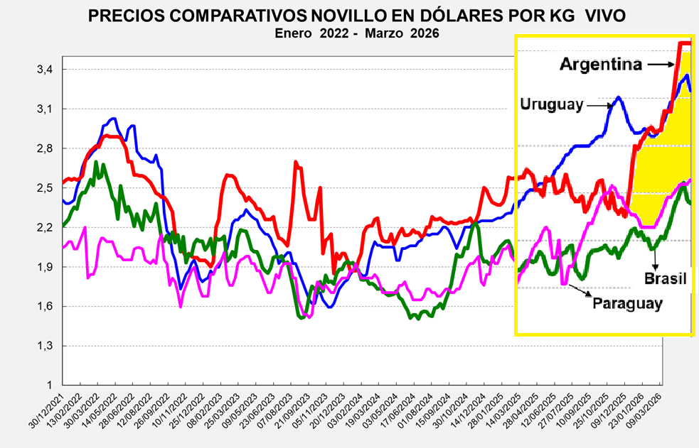 Precios promedio de novillos, vacas en US$ Argentina, Brasil, Uruguay, Paraguay, EE.UU. , Australia y Nueva Zelanda.