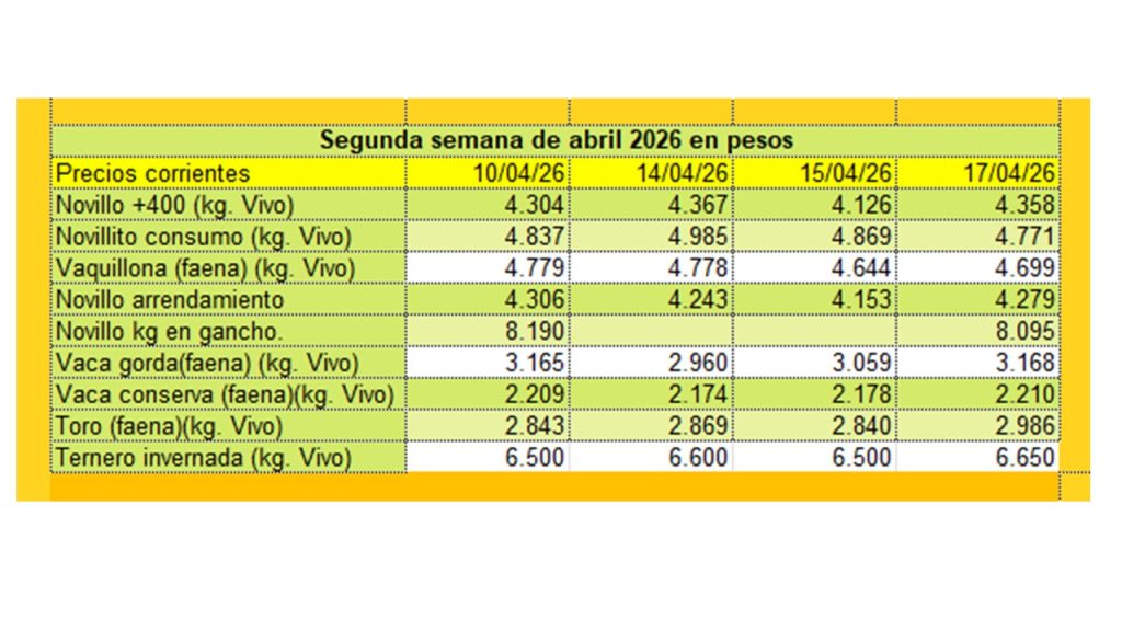 Precios corrientes de gordo, invernada e índice de novillo para arrendamiento