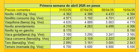 Precios de hacienda e índice de novillo para arrendamiento