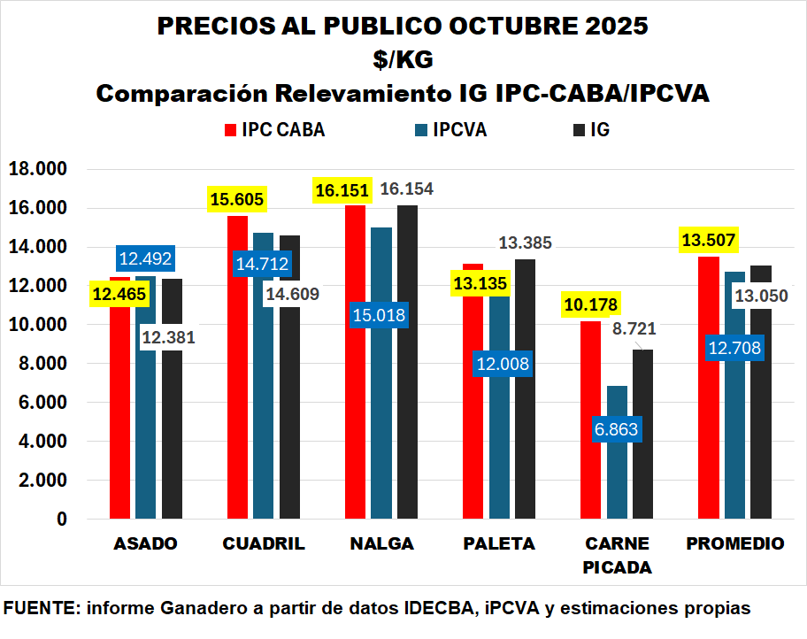 En octubre de 2025, los precios medios de los cortes bovinos relevados por el Instituto de Estadísticas y Censos de la C.A.B.A (IDECBA) aumentaron en promedio 2.8 por ciento, las variaciones mayores se observaron en Asado (3.6%) y Nalga / Cuadrada (3.2%). Con la excepción de la carne picada, por primera vez en los últimos meses, han crecido por encima del Nivel General del IPC.