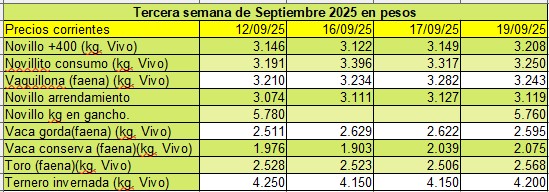 Precios de hacienda gorda, invernada, indice de novillo para arrendamiento y carne en gancho
