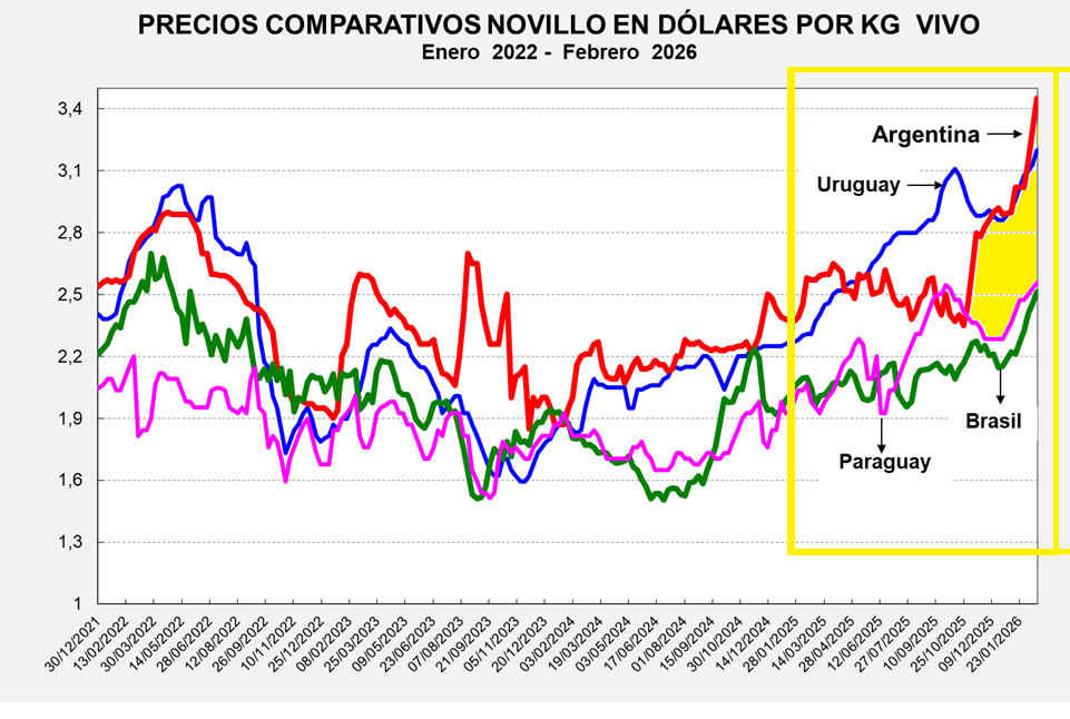 Precios regionales, Argentina sube la vara semana a semana: Brasil: luego de los feriados de Carnal el mercado continuó demostrando firmeza. El Boi China alcanzó el nivel récord de 4.5 US$ por kg gancho! Una evolución similar se observó en el resto de la región, la oferta es escasa para atender los compromisos del exterior y a los consumidores locales. En nuestro país, la apreciación del peso acentuó la suba.