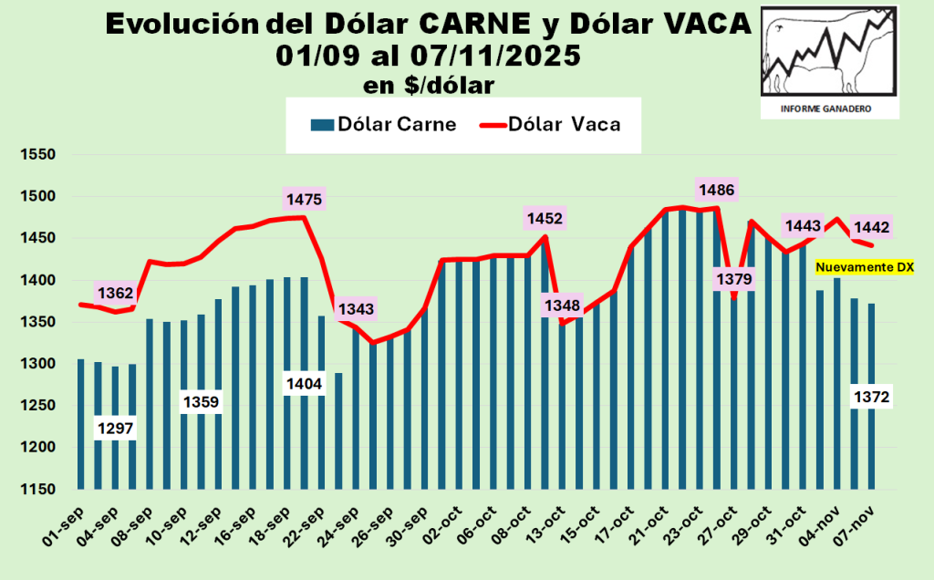 En la primera semana de noviembre, volvieron a aplicarse derechos de exportación sobre las exportaciones de carnes vacunas, que no proceden de las categoría Vacas. Esta modificación se conjugó con una caída en la cotización del Dólar, que determinó una reducción en el tipo de cambio comparado con el nivel que tenía antes de la medida transitoria que, bajo condiciones bastante restrictivas, unificó las retenciones en el O% entre el 24 de setiembre y el 31 de octubre, próximos pasados.