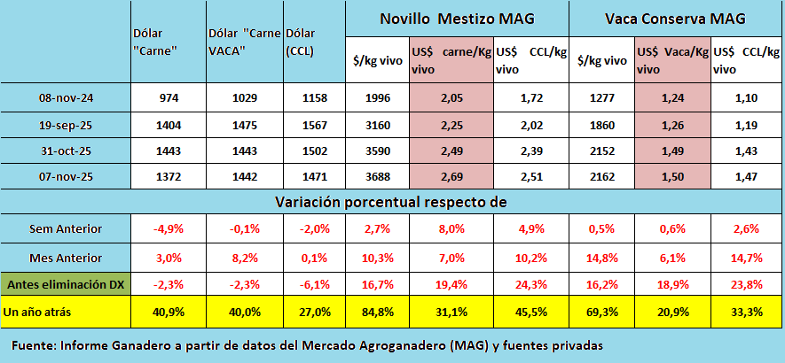 En el MAG, hubo aumentos en los valores del novillo y de la vaca conserva, más marcado en el primer caso, lo que ha llevado el equivalente en dólares a 2.70 US$/kg vivo.