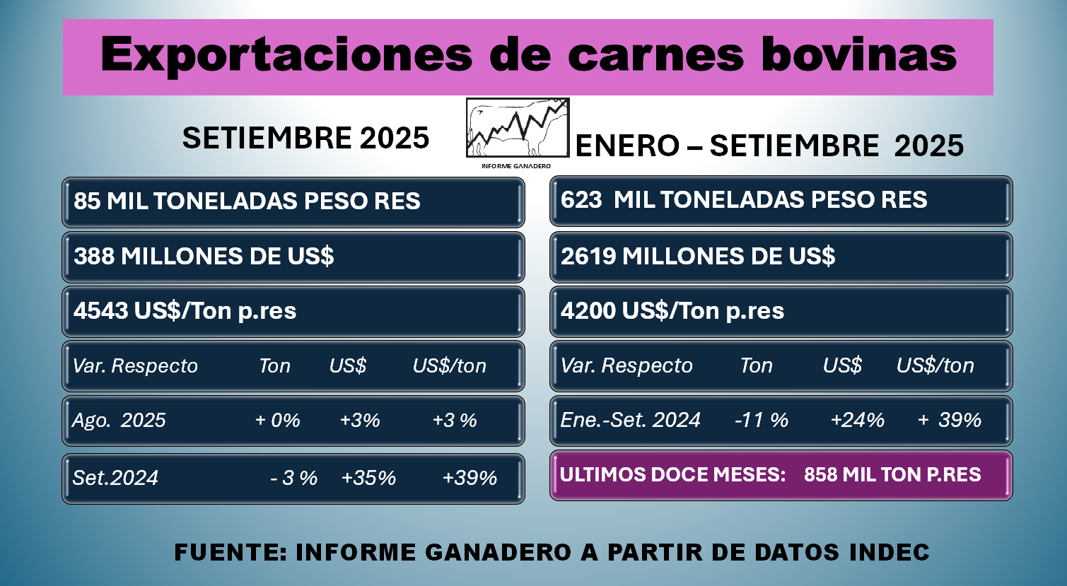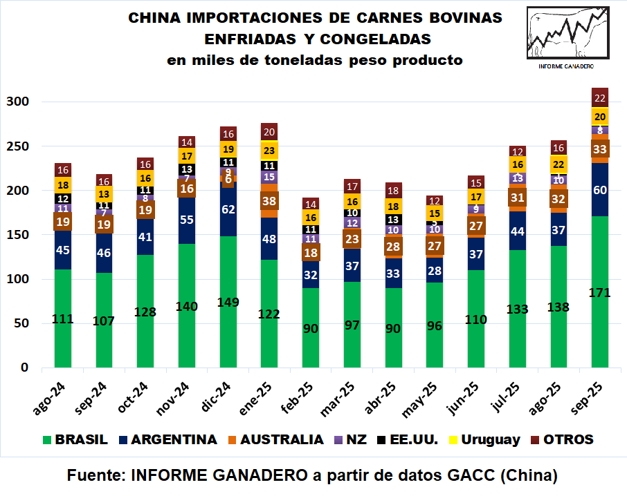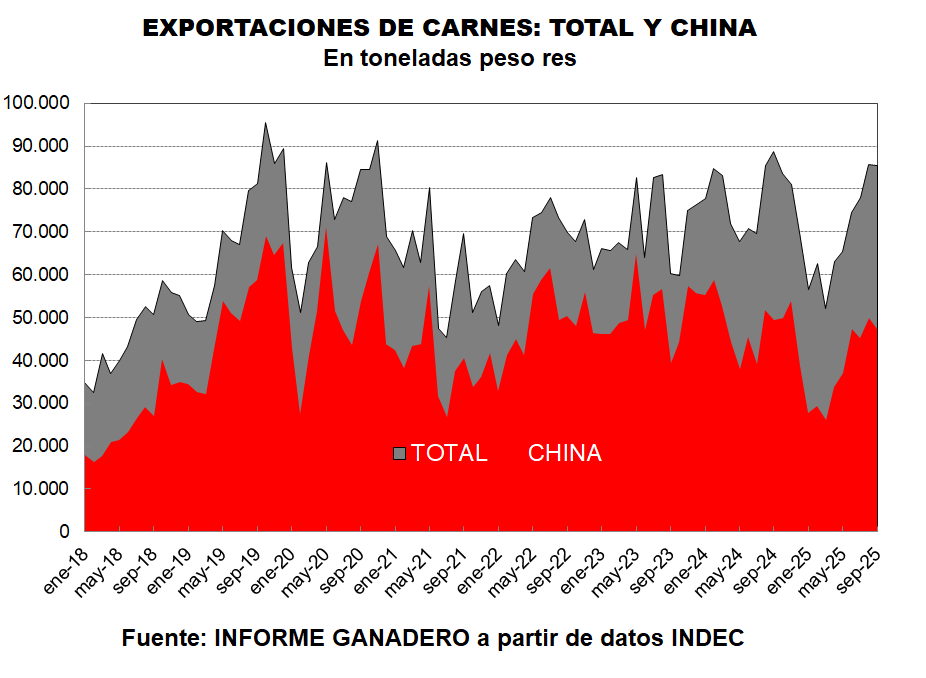 Evolución de los embarques argentinos a CHINA, carnes congeladas con y sin hueso. SETIEMBRE 2025