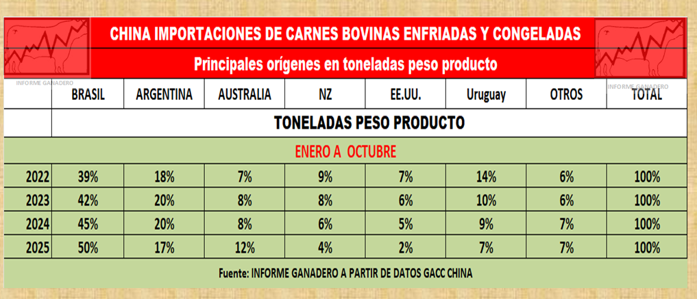Exportaciones de carnes bovinas Principales Orígenes a OCTUBRE de 2025