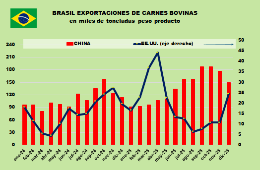 Evolución de los embarques de carnes bovinas a Diciembre de 2025. Datos Secex Brasil
