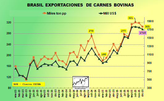 Exportaciones de carnes bovinas enfriadas y congeladas. Acumuladas a Noviembre 2025