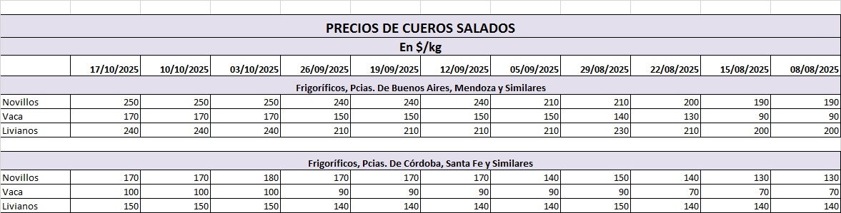 El precio de los cueros salados, al 22-8-25, muestra un leve repunte (con respecto a la semana anterior) en casi todas sus categorías, pero es más fuerte el repunte en las vacas provenientes de Buenos Aires y Mendoza. Pero en las vacas provenientes de Córdoba y Santa Fe el precio se mantuvo estable.