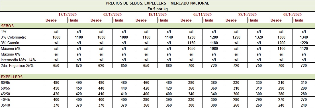 PRECIO DE LOS SEBOS Y EXPELLERS, AL 17/12/25