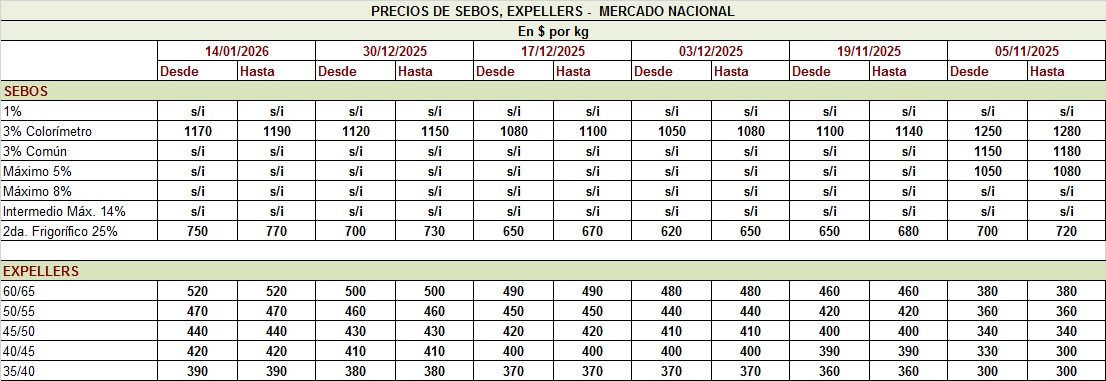 PRECIO DE LOS SEBOS Y EXPELLERS, AL 14-1-26