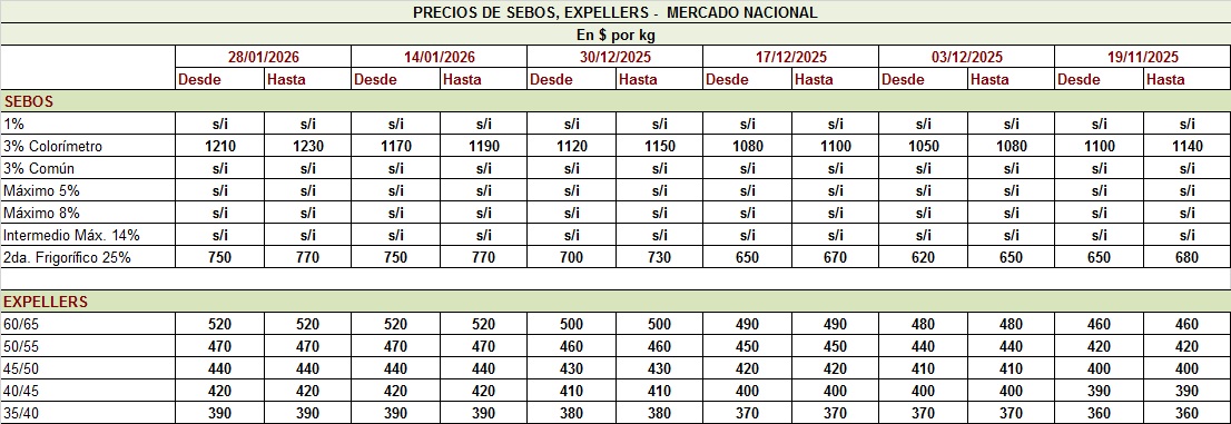 PRECIO DE LOS SEBOS Y EXPELLERS, AL 28-1-26