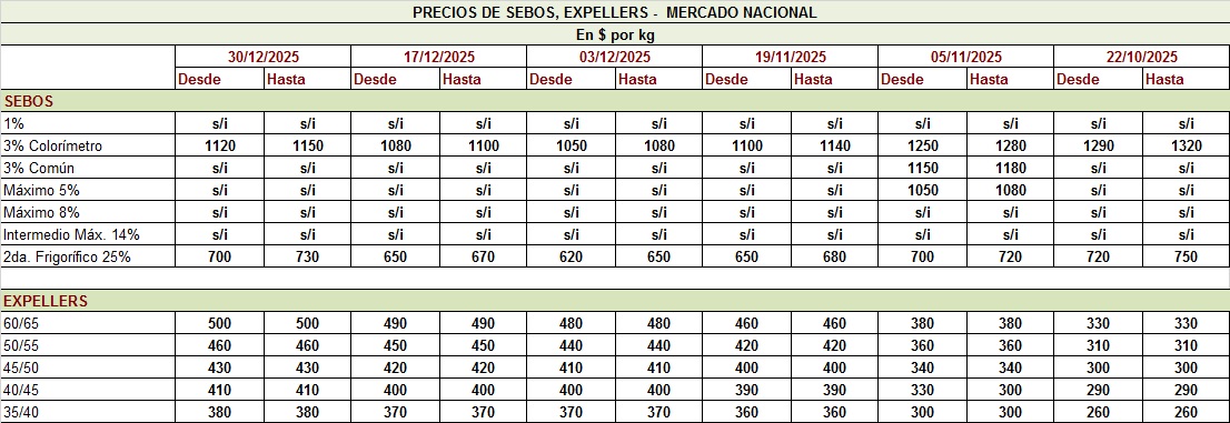 PRECIO DE LOS SEBOS Y EXPELLERS, AL 30/12/25
